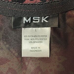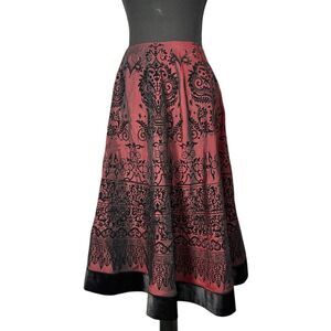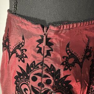 Size L, Red Satin like with Black Flocked design, A Line skirt. Excellent pre-owned condition.