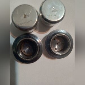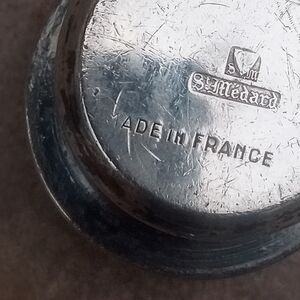 This vintage set of St Medard French salt and pepper shakers features a unique mushroom shape in silver plating. Made in France, this original set includes a pepper shaker and a salt shaker, perfect for adding a touch of French style to your kitchen decor. Standing at 1 inch tall and 1 inch wide, these shakers are a charming addition to any collection of kitchen tools and gadgets.
