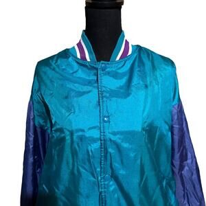Vintage MVP Corp Blue and Purple Satin Sports Jacket Women's S Small. Turquoise and Purple Colorblock. Snap Closure. Striped Trim. Retro Vintage 90's. No Size Tag; Use Measurements in Pics. Good Vintage Condition.