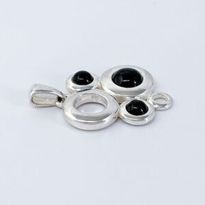 This striking vintage pendant features a bold modernist design with bezel-set garnet cabochons arranged in an abstract circular pattern. The polished sterling silver setting enhances the deep red hues of the gemstones, creating a unique and artistic look. A statement piece perfect for collectors of modernist jewelry.