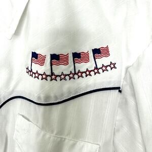 Vintage MWG Apparel Western Shirt. White with tonal stripes. Embroidered American flags and stars on front. Pearl snap front and cuffs. Snap chest pockets. Black piping.