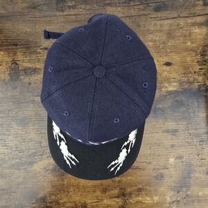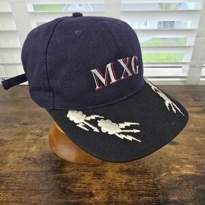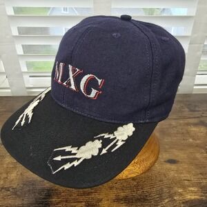 Vintage U.S. Air Force MXG (Maintenance Group) hat made in America by MDI Wearables, Spokane, WA. Navy blue strapback cap featuring bold MXG embroidered on the front in white and red, with lightning bolt and cloud embroidery on the brim—symbolic of aircraft maintenance and ground crew support. Brass buckle strapback closure. Small mark on brim—see photos. In good vintage condition overall. A rare find for military collectors or veterans.