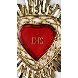 Vintage MY JESUS IHS MY MERCY Metal Heart Shaped Plaque w/Red Glass Heart Center
