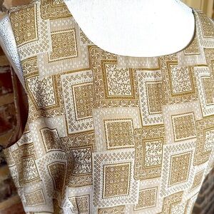 Unique vintage sleeveless top featuring a square geometric print. This eye-catching piece has a blend of neutral tones, rounded neckline and a smooth lining, and a rear zipper offering a comfortable and stylish fit. This top exudes a sophisticated charm. Approximate Measurements: