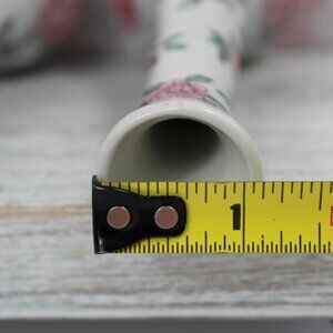 The pair of vintage H.F.P. Macau porcelain floral botanical bud vases feature hand-painted Chinoiserie pink flowers on a white background. These vases are sturdy ceramic with a dimensional raised enamel surface. The vases are the perfect part of your boho, cottage, or shabby chic vintage decor.