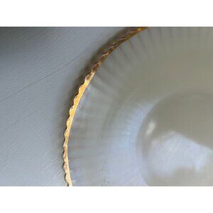 This vintage white opalescent glass dish, scalloped edges serves as an elegant decorative piece or functional dish for any setting.