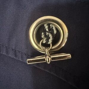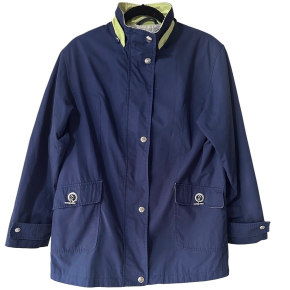Vintage Mackintosh nautical sail boat themed rain coat with zipper and button detail. Navy blue and green in color. Double pockets with toggle closure.