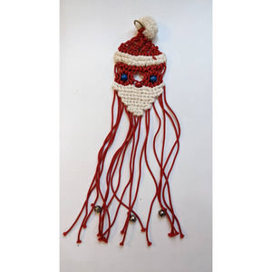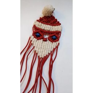 Super cool vintage macramé Santa Claus decoration/wall hanging made wood beads, a pompom, and jingle bells. It has a small brass ring at the top to hang from a place of your choosing. If you like boho, kitschy Christmas decorations this is the piece you're looking for!