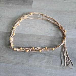 Vintage Macrame Beaded Belt Beige Wood Beads BOHO Hippie Handmade Fringe 34"