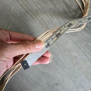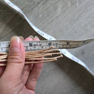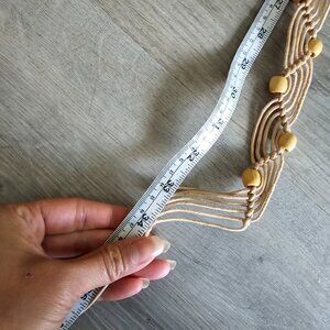 This vintage macrame beaded belt is a unique piece crafted by hand in the 1990s. The beige color and boho look make it a versatile accessory for everyday wear. Featuring wood beads and a fringe detail, this handmade belt in hemp material exudes a hippie vibe, perfect for women embracing a relaxed and retro style. With a length of 34" inches knot to knot and a total length of 66", this original piece adds a touch of vintage charm to any outfit.
