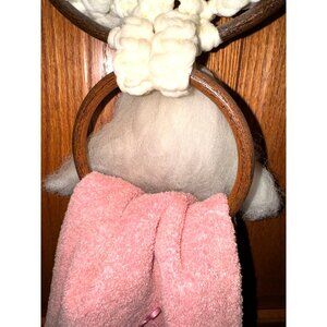 This charming vintage macrame owl towel holder evokes nostalgia with its intricate design and delightful pink towel adorned with lace trim. The woolen texture and wooden hoops add a rustic touch, making it a wonderful addition to any vintage-inspired home decor collection.