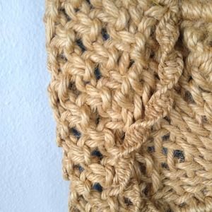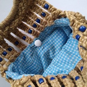 Amazing vintage handmade macrame tote bag. The body of the bag is made from natural jute - the macrame detail and patterning is incredible. Accented with blue wood beads. Two round wood handles. Lines with cornflower blue and white gingham check fabric. One interior pocket with a round white button to keep it closed if desired.