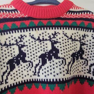This vintage 90s Y2K festive holiday kids sweater features a bold reindeer design with vibrant red, green, and white tones. Crafted from 100% acrylic for warmth and durability.