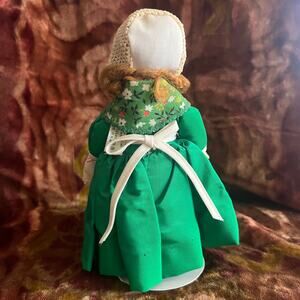 • Light ginger hair and green eyes with a green taffeta dress and floral scarf with an underskirt, cream lace-trimmed apron, crochet lace bonnet, stockings, shoes, pantaloons