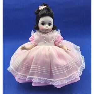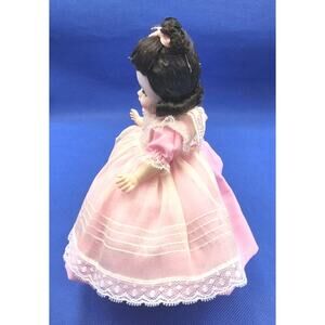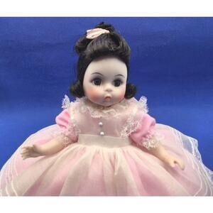 The Vintage Madame Alexander-Kins 8" Doll is a collectible artist doll depicting the character Beth from the Little Women franchise. This original doll from the Madame Alexander brand features black hair, a light complexion, and comes with a display brand and in its original box. Standing at 8 inches tall, this girl doll is perfect for all occasions and would make a great addition to any doll collection for fans of the Little Women series.