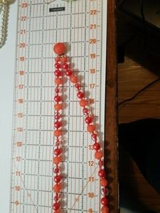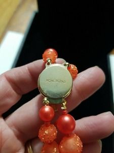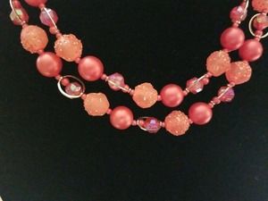 Vintage Made In Hong Kong Demi Parure Double Stranded Neckace And Earrings. This is a beautiful set with a pinkish orange color almost a coral but something in-between. There are what is called sugar coated beads that sparkle a bit a hidden clasp these are Made in Hong Kong. They have minor wear as would any vintage piece of this age but overall in good condition. It is a gorgeous set.