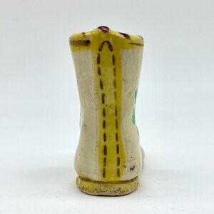 Hand-painted ceramic boot marked Made in Japan, dating mid-century. Compact and colorful with floral detailing, light crazing throughout. Originally a novelty collectible but often used as a mini planter or display piece.