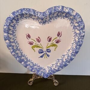 Charming heart-shaped plate. Features floral design. Blue trim with intricate pattern. Perfect for display or serving.
