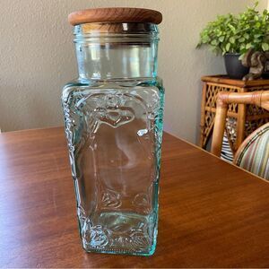 Vintage Made In Italy Turquoise Glass Canister Jar Food Storage With Wood Lid