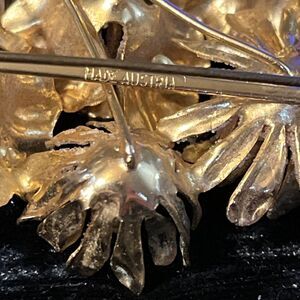 This vintage brooch is a stunning piece featuring an asymmetrical design with a beautiful floral pattern. Crafted in Austria during the 1950s, it is signed and made with crystal rhinestones in a gold tone setting. Perfect for special occasions like Mother's Day, weddings, and anniversaries, this brooch exudes glamour and elegance. The multicolor crystal stones and bold design make it a striking statement piece that will surely add a touch of beauty and sophistication to any outfit or accessories collection.