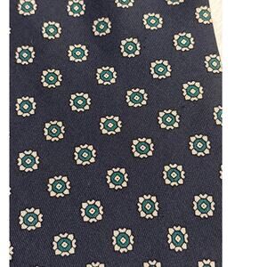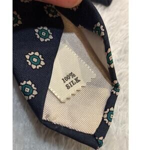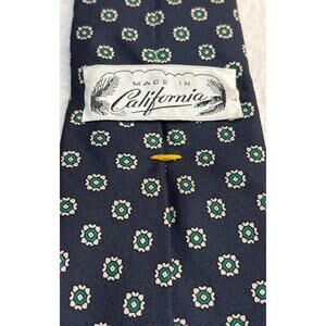 Beautiful vintage “Made in California” 100% silk tie featuring a navy background with an emerald and ivory geometric medallion pattern. A timeless mid-century design crafted from smooth, high-quality silk.