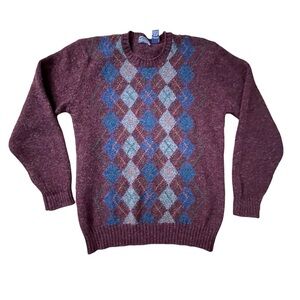 Vintage Made in England 100% Wool Argyle Sweater L – Burgundy Heather, Blue/Grey