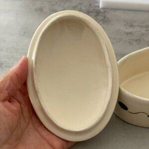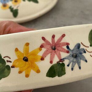Rustic hand made ceramic oval trinket dish with lid decorated in hand-painted florals and leaves. If you like things that have the look and feel of an artist's hand this one is for you. It is not "perfect" as it hand made with slips in glaze and irregular flowers, but it has the charming look of French Country which we love.