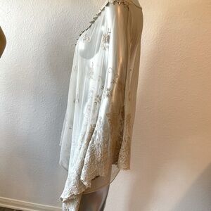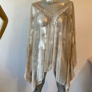 So feminine. Many ways to wear. Sheer net with lace embroidery. Butterfly sleeves just float. Beautiful detail. Color is a blend of cream and ecru. Blends easily with other colors. Mannequin is a Sz6. This would fit 6-10 depending how relaxed you prefer.