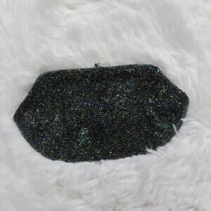 Vintage Made in Japan black beaded kiss lock purse. Black with blue shift beaded kiss lock purse.