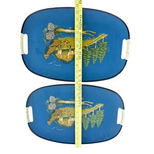🦌 Vintage Made in Japan Deer Scene Fiberglass Serving Trays Set of 2 MCM. Retro mid-century Japanese fiberglass trays with scenic deer print, pinecones, and textured finish. Rich blue background with rattan-wrapped handles, lightweight yet sturdy. Perfect for cottagecore kitchen décor, camping serveware, or retro bar setup. Excellent for display or functional serving.