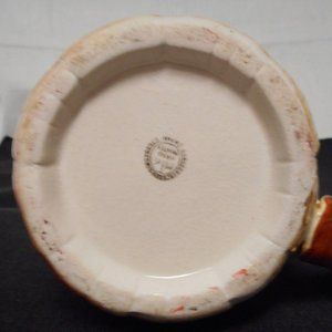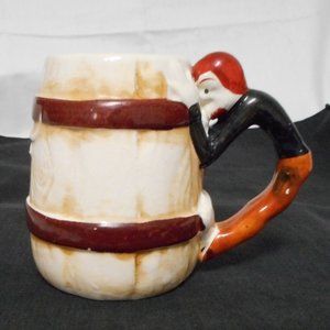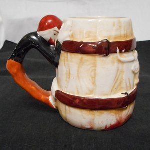 Vintage ceramic mug, body resembles a barrel, with a steer's head, figural man handle, perhaps meant to represent a ranch hand, approximately 4 1/2 inches tall, 2 1/2 inches in diameter at rim, marked on base with a Hand Painted Japan ink stamped mark, light cold paint loss, no chips, no cracks.
