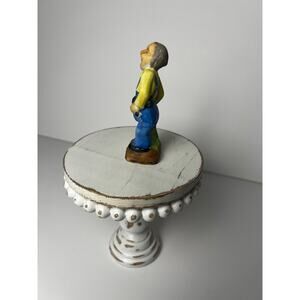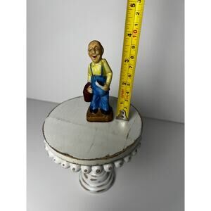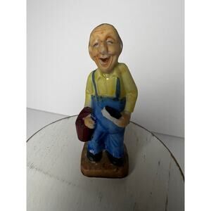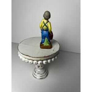 Step back in time with this charming and historically significant figurine. This collectible was created during the period of American occupation of Japan following World War II (1945-1952) and is a tangible piece of that era. The hand-painted ceramic piece features a joyful farmer or gardener in blue overalls and a yellow shirt, holding a red basket and a tool.