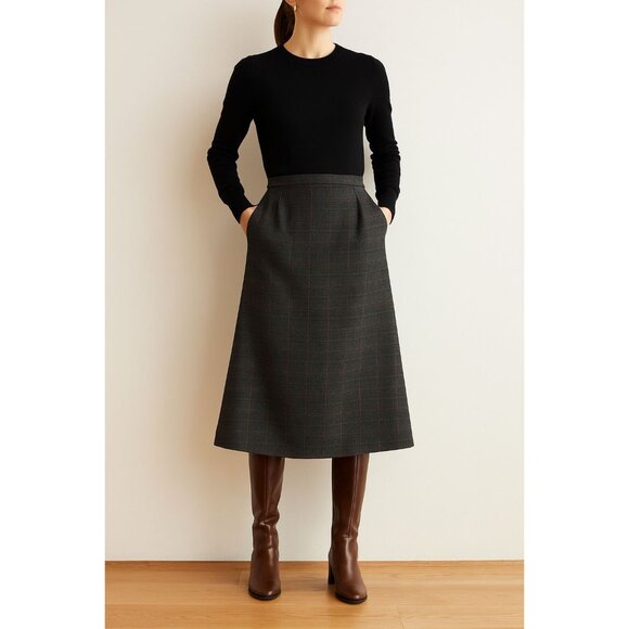 Style: High-waisted A-line midi skirt with rear kick pleat