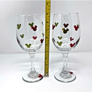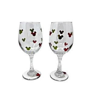 Add a touch of Disney magic to your table with this set of two 20 oz (591 mL) stemmed wine glasses. Each glass features festive red and green Mickey Mouse head silhouettes, perfect for holidays, Disney fans, or everyday fun.