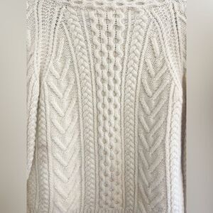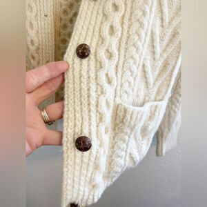 Lovely rustic and chunky cable knit cardigan with a soft wool. Hand made in Ireland. Two front pockets. Brown buttons. Shows some sign of wear on buttons, it’s vintage. Armpit to armpit 20”, length 24”. No size tag guessing small/medium.