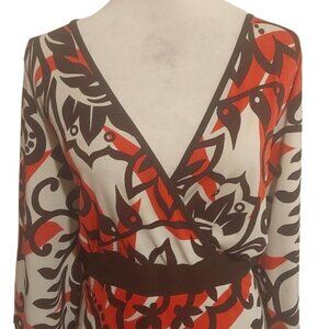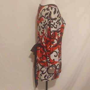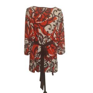 Vintage Maggie Barnes woman's boxy faux wrap top with tied waist in orange, black, and white geometric floral pattern. This retro Y2k style complements one's curves with the v neckline and stretch horizontal waist. Versatile as can tie on either back, or front to side.