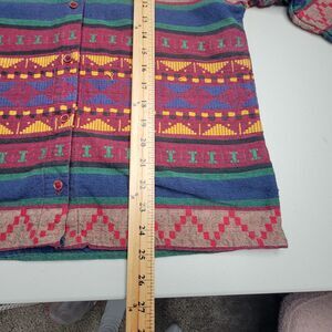 Eye-catching vintage 80s/90s Maggie & Max button-down shirt featuring bold southwestern geometric and stripe patterns in burgundy, navy, green, yellow, and red. Lightweight cotton with a soft handfeel and excellent drape. Unisex and versatile perfect for a relaxed slouchy fit or worn tucked in for that vintage western vibe.