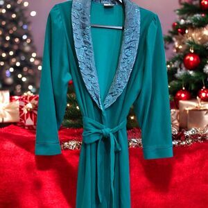 Zoom in for details. You will receive the exact robe shown. Appearance may vary with background, lights, or screen. Color is a gorgeous teal green (more green than blue). Hard to capture the green in the images - turns up blue or too green. Typical vintage wear. In nice condition with tiny hole behind neck collar or seen near bottom of front tag. Appears with light mending at the hem line. Clean - washed before photos. There are no obvious stains. The size tag is worn off. Measurements are below. The measurements may correspond with an XS (not certain at all). The robe is long but can easily be hemmed. Retro glam intimate lounge wear. Enjoy!