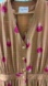 Vintage Maggy London Silk Button Front Abstract Sheath Dress Sz 10. Great abstract vintage dress in a true tan color with large red dots and abstract pattern. V-neck front. Button to waist with extra hidden snap. Small shoulder pads.