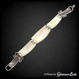 Vintage artisan handcrafted silver tone links shell bracelet featuring iridescent magpie shell panels in creamy white, black, brown and green.