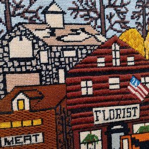 Vintage Main Street Wall Art Needlepoint Fiber Embroidered Decor Framed 1980s Florist
