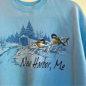 Vintage “Maine” Sweatshirt Baby Blue Snowy Bird Winter Scene Chickadees Glitter