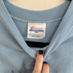 Vintage “Maine” sweatshirt baby blue snowy winter scene with chickadees, crewmen, glitter detail.