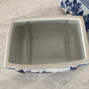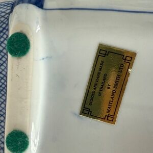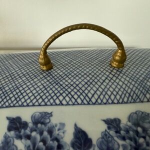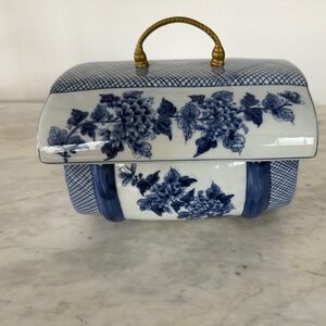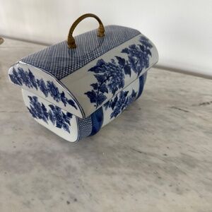 Hand made in Thailand Maitland Smith blue and white porcelain trinket box. In perfect condition with a metal (brass?) handle. Measures 7-1/2 inches wide,