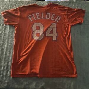 The product is a vintage Majestic Texas Rangers #84 Fielder red t-shirt jersey in size large. This graphic print shirt features Fielder's character and is made of cotton jersey fabric with a crew neck and short sleeves. The shirt is designed for unisex adults and has a regular fit, making it suitable for all seasons. It is a double-sided shirt with a sports theme, perfect for fans of MLB and the Texas Rangers team. Please see photos for condition.