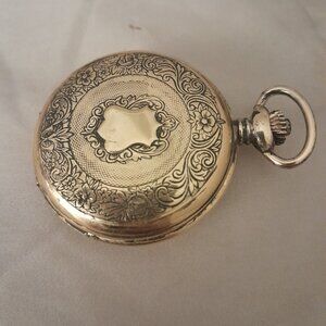 Gold tone pocket watch with nice etched design. White face. Black Roman numerals. Clear glass with no scratches. Good condition. Majestron Quartz with Quartz parts. Fresh battery needed. About 2" in diameter. A lovely timepiece.