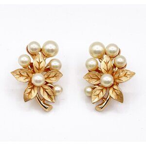 The earrings feature a gold-tone floral spray cluster design, with luminous creamy pearls nestled among textured leaves. Their elegant shape makes them perfect as wedding earrings, mother of the bride jewelry, or a classic cocktail evening accessory.