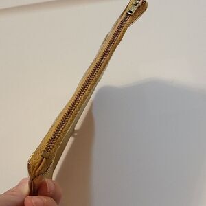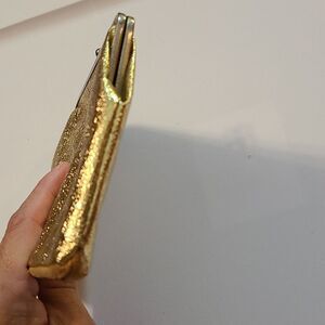 Vintage gold metalic kisslock makeup bag. Zipper at bottom of bag for extras. Opens up to a pink textured lining.