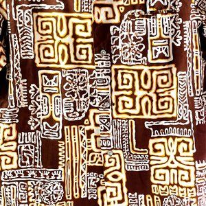 Vintage Malihini Hawaii men's Hawaiian shirt Tiki Geometric Pattern print in brown, gold and white. Pearl Colored wrapped buttons. There is no size tag but based on the measurements in comparison to other shirts I have for sale, I believe this is a men's size medium. Please look at all measurements before purchasing.