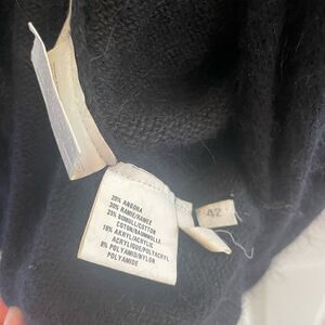 This soft cozy black low wrap vintage sweater is by Malina Wong.  The sweater is made up of an Angora hair blend.  The sweater has beaded strands cascading off of the sweater.  The sweater attaches low so a cami would need to be worn underneath. It is a German size 42, which translates to a US women’s size Medium, 8-10.  Very nice condition!